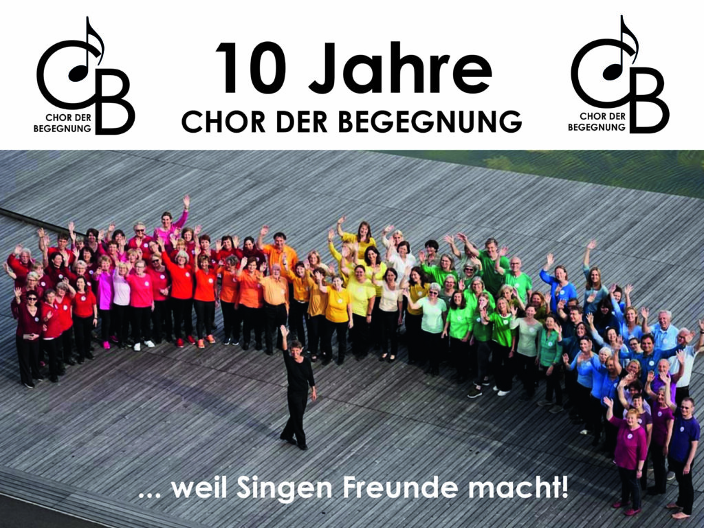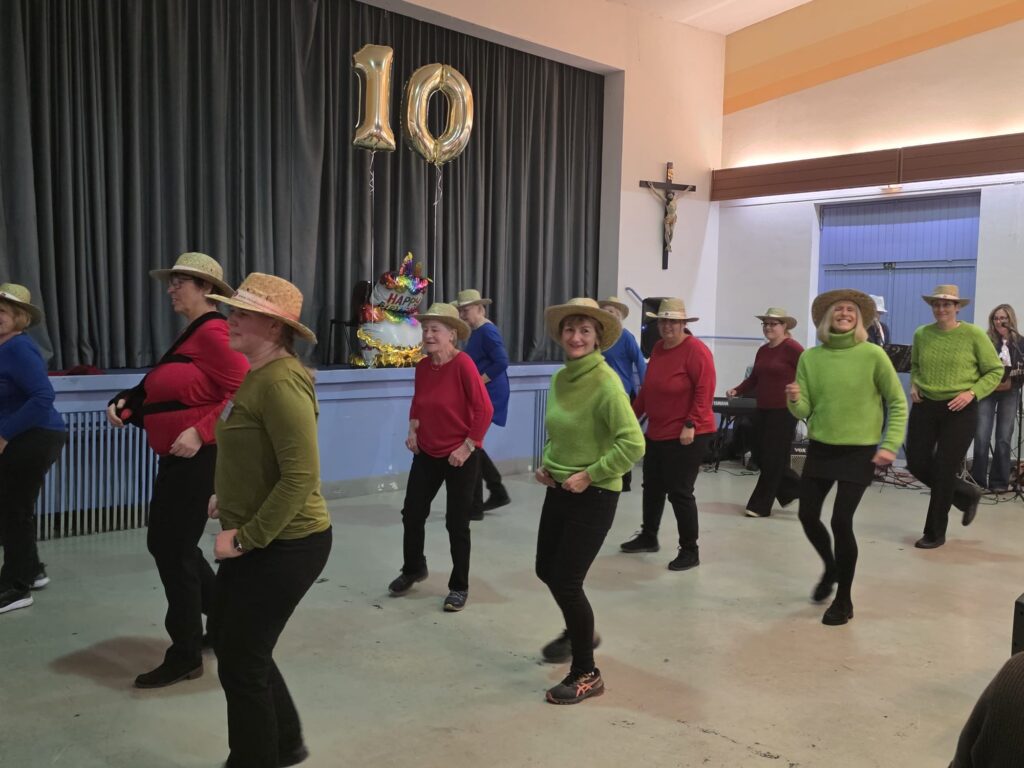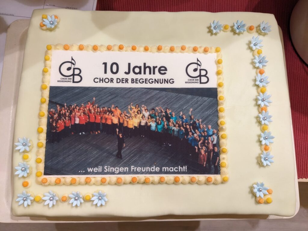 Es erklangen Lieder aus den letzten zehn Jahren, für jedes Chorjahr eines. Die CdB-Band dichtete Texte eigens für unser Jubiläum um, unsere Dichterinnen übertrafen sich einmal mehr selbst, und mit Bandbegleitung wurde sogar ein Linedance aufgeführt. Zum krönenden Abschluss durfte natürlich auch eine Geburtstagstorte nicht fehlen.